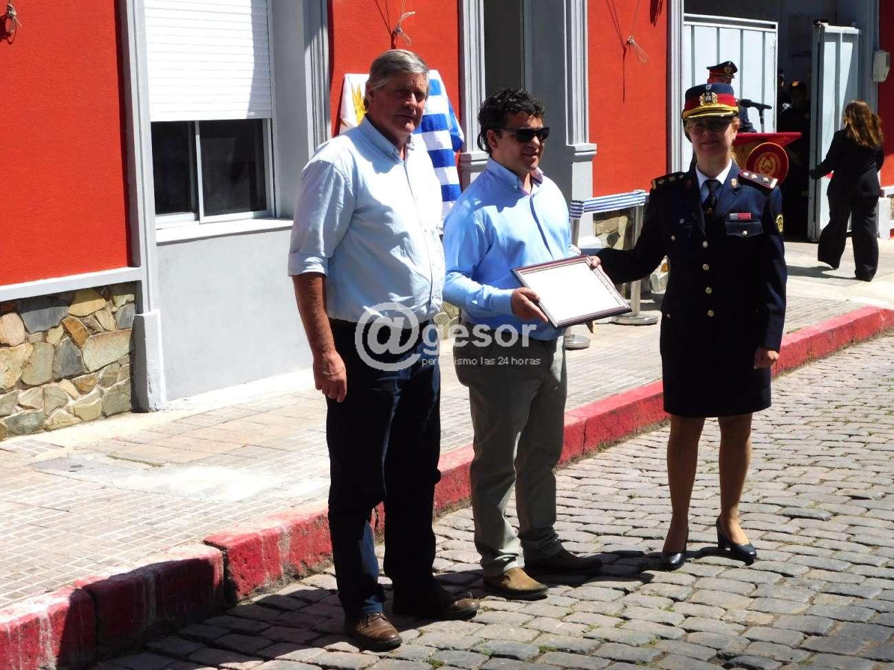 El Cabo Gustavo Aguirre por su reciente pase a retiro voluntario habiendo desempeñado funciones en el Destacamento de Bomberos de Mercedes por casi 25 años de manera ininterrumpida. Entregaron el Jefe de Policía de Soriano Crio. May. Jorge Falero y el Sub Director Nacional de Bomberos Crio. May. Martín Bogao.