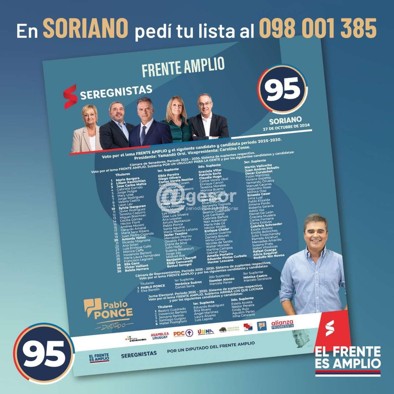 La lista 95, que lleva como candidato a la Diputación al Maestro Pablo Ponce, y al Senado a Mario Bergara, Liliam Kechichian y José Carlos Mahia, ya está disponible para entregar, la podes solicitar a través de whatapp, haciendo click en este enlace https://wa.link/arlkhk o escribiendo al 098001385, para recibirla en tu domicilio.