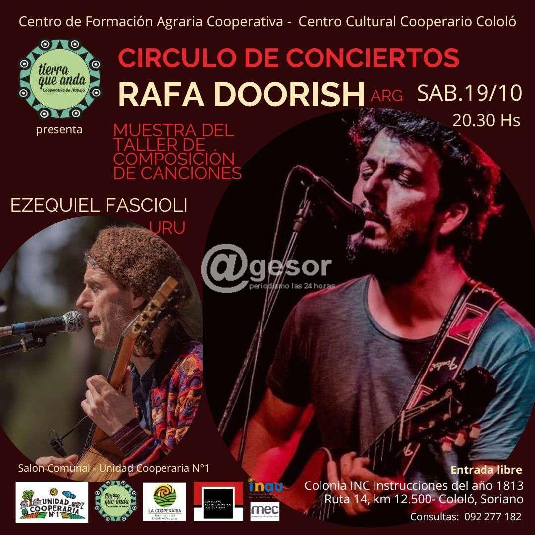 El músico Rafa Doorish estará realizando un "Taller de composiciones" y un concierto de música, en la Unidad Cooperaria Nº 1, Cololó. Estas dos actividades se dan en el marco del Curso de Cría de Terneros y Manejo de pasturas en el Centro de Formación Agraria Ccoperativa, de Tierra Que Anda en convenio con INAU.