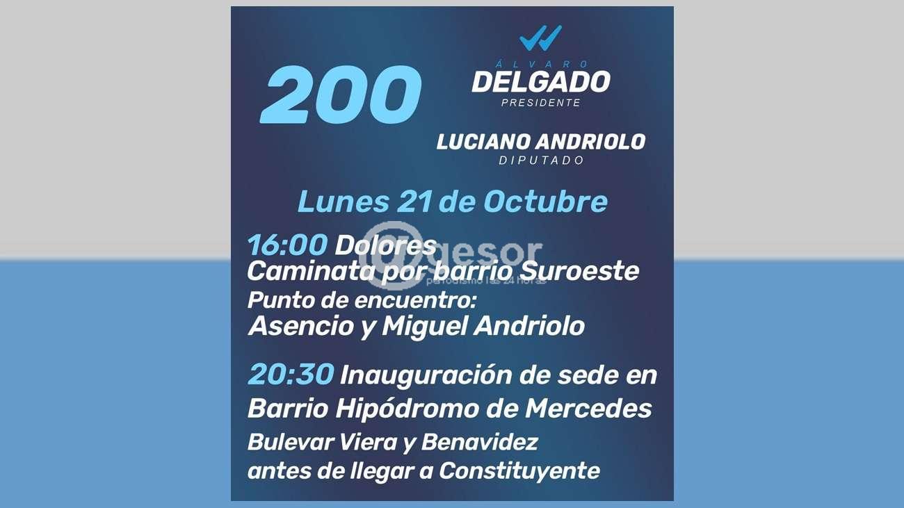 Luciano Andriolo, candidato a diputado por la Lista 200 del Partido Nacional cumplirá con un par de actividades este lunes. A las 16 horas realizarà una caminata por el barrio Suroeste de Dolores. Punto de encuentro: Asencio y Miguel Andriolo.