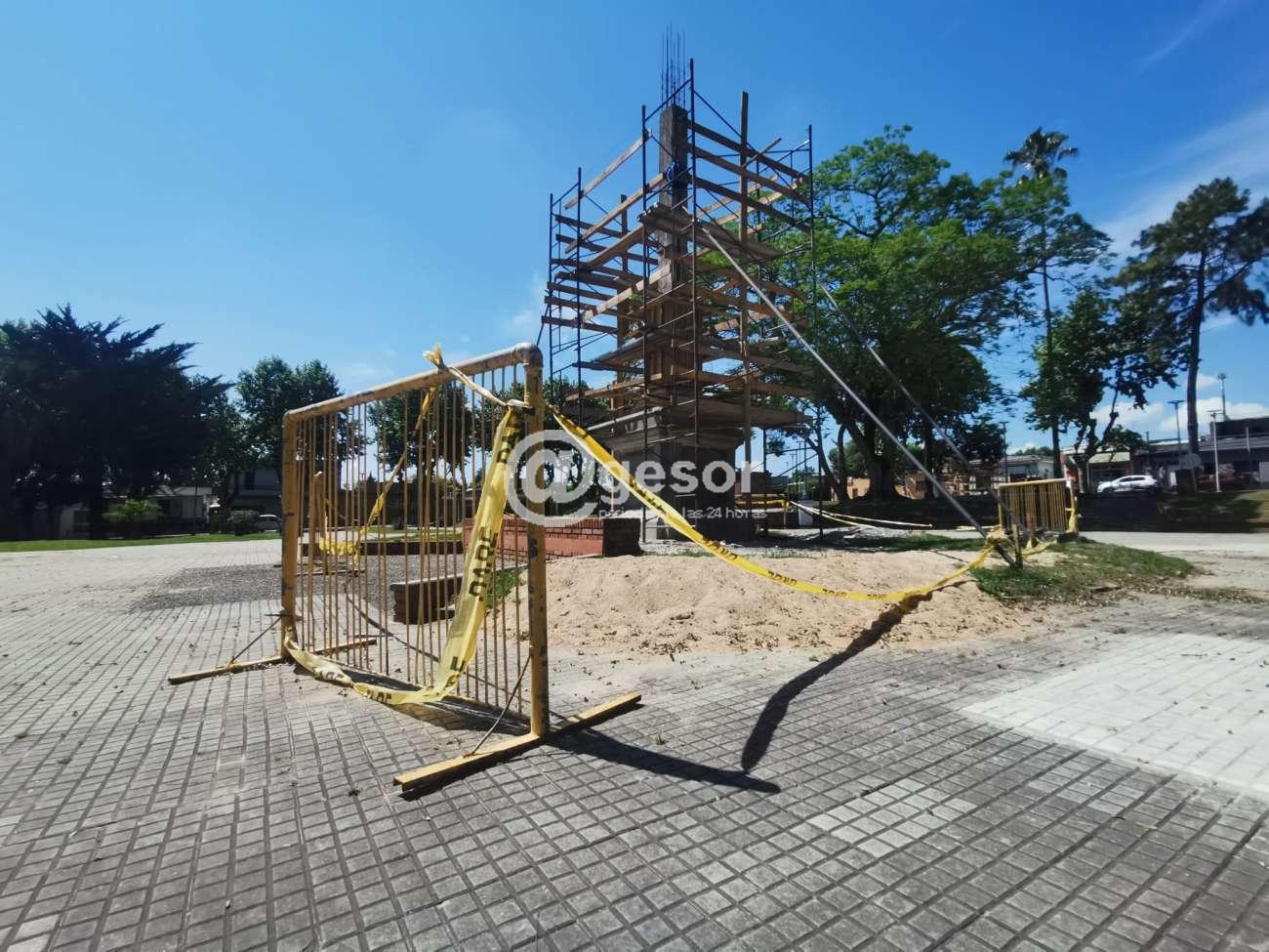 Los trabajos en la conformación de la nueva columna de la Libertad en plaza Rivera avanzan notoriamente, destacándose la colocación del encofrado en la parte inferior de dicha columna.