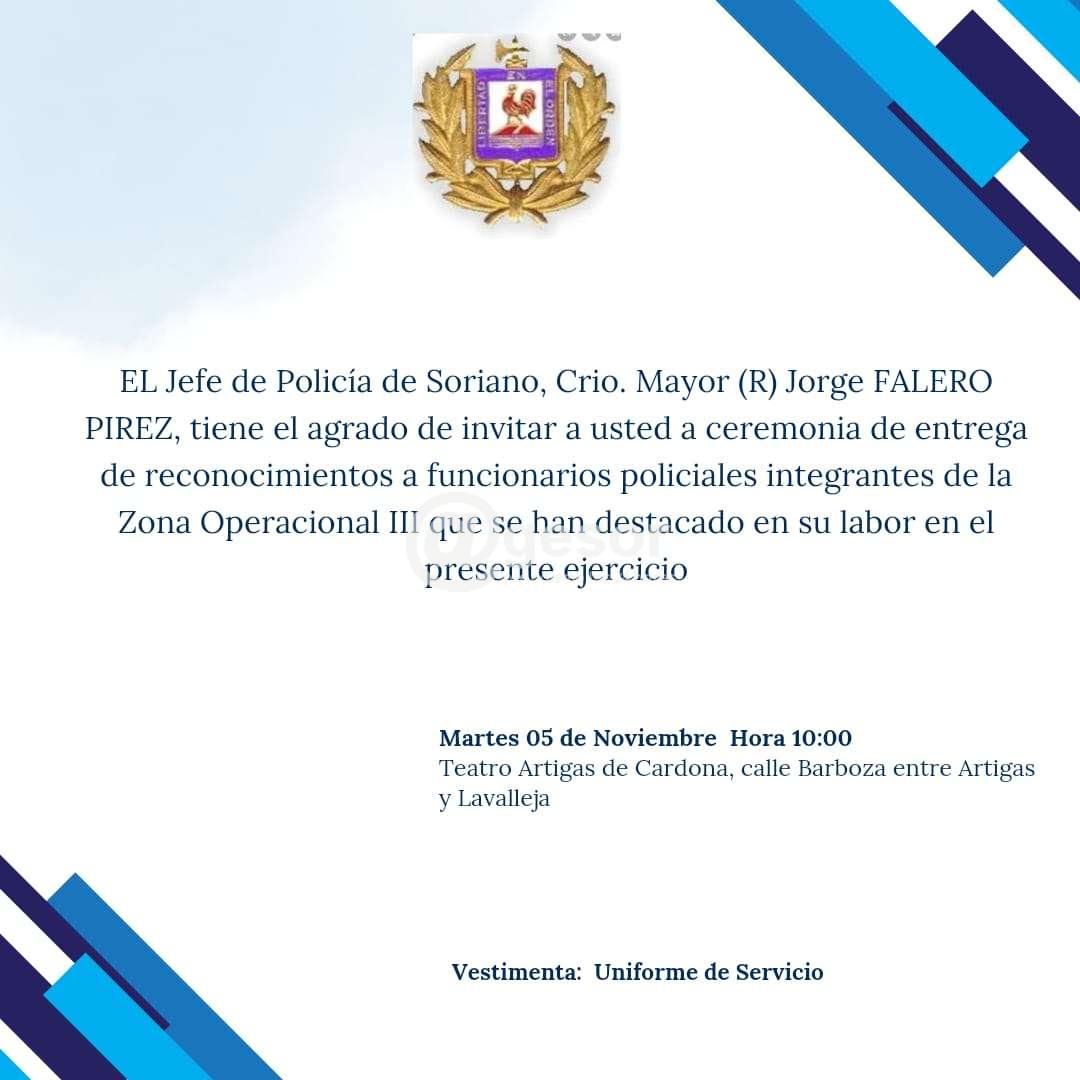 La Jefatura de Policía de Soriano, está invitando para ceremonia de reconocimiento a efectuarse este martes 5 de noviembre en la ciudad de Cardona.