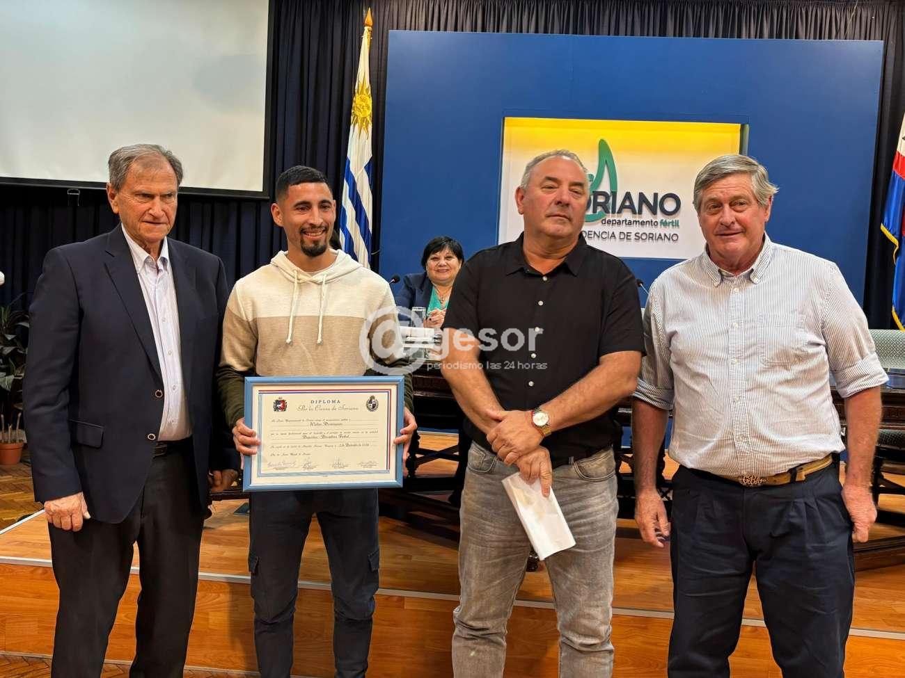 El Edil Raúl Morossini, en el marco de la sesión extraordinaria de la Junta Departamental de Soriano para la entrega de los Diplomas "Por la Causa de Soriano" hizo uso de la palabra para efectuar el reconcimiento por un lado al futbolista Walter Domínguez, que fue galardonado en el momento como Mejor Futbolista del Interior durante la Copa de Selecciones de OFI, goleador y además fue convocado para la Selección de Uruguay que disputó encuentro amistoso en Costa Rica donde participó durante algunos minutos.