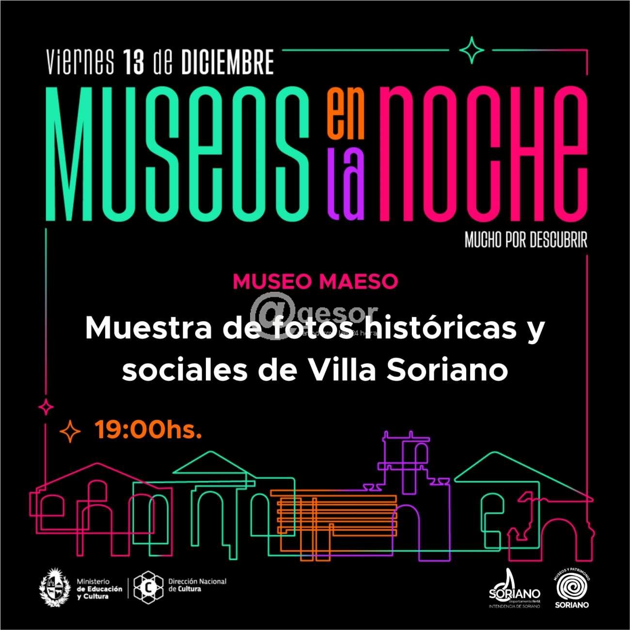 - Villa Soriano también ofrece la oportunidad de disfrutar de la "Noche de los Museos", habilitándose a partir de las 19.00 horas el "Museo Maeso" para poder apreciar muestra de fotos históricas y sociales de Villa Soriano.
