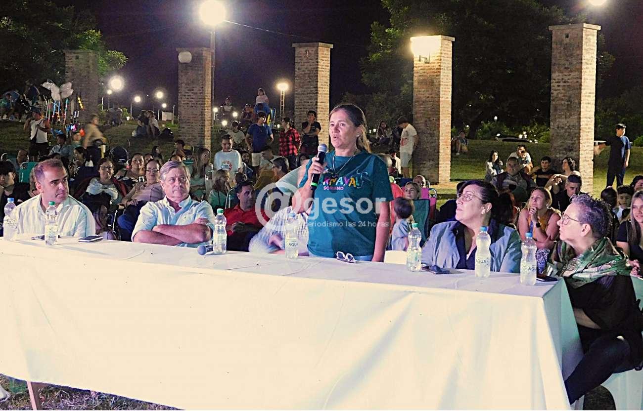 La tengo a Andrea Dibble al lado mío, que si hay una Reina del Carnaval adentro de la Intendencia, es ella, Andrea lleva sobre sus hombros, junto a la Dirección de Cultura, con el Sub Director y todo el equipo de Cultura, siempre digo que nos toca tomar el micrófono a alguno de nosotros, pero hay gente que hace muchísimo más que nosotros y está siempre, esa es Andrea, en junio es ella que me viene a decir ¿cuándo arrancamos con el carnaval? ¿qué carnaval vamos a hacer? ¿qué características le vamos a dar? ¿cuántas categorías va a haber? Le voy a pedir a ella que se dirija a ustedes porque los protagonistas son todos los conjuntos que participan y la gente que disfruta un gran Carnaval como hay aquí en Soriano".