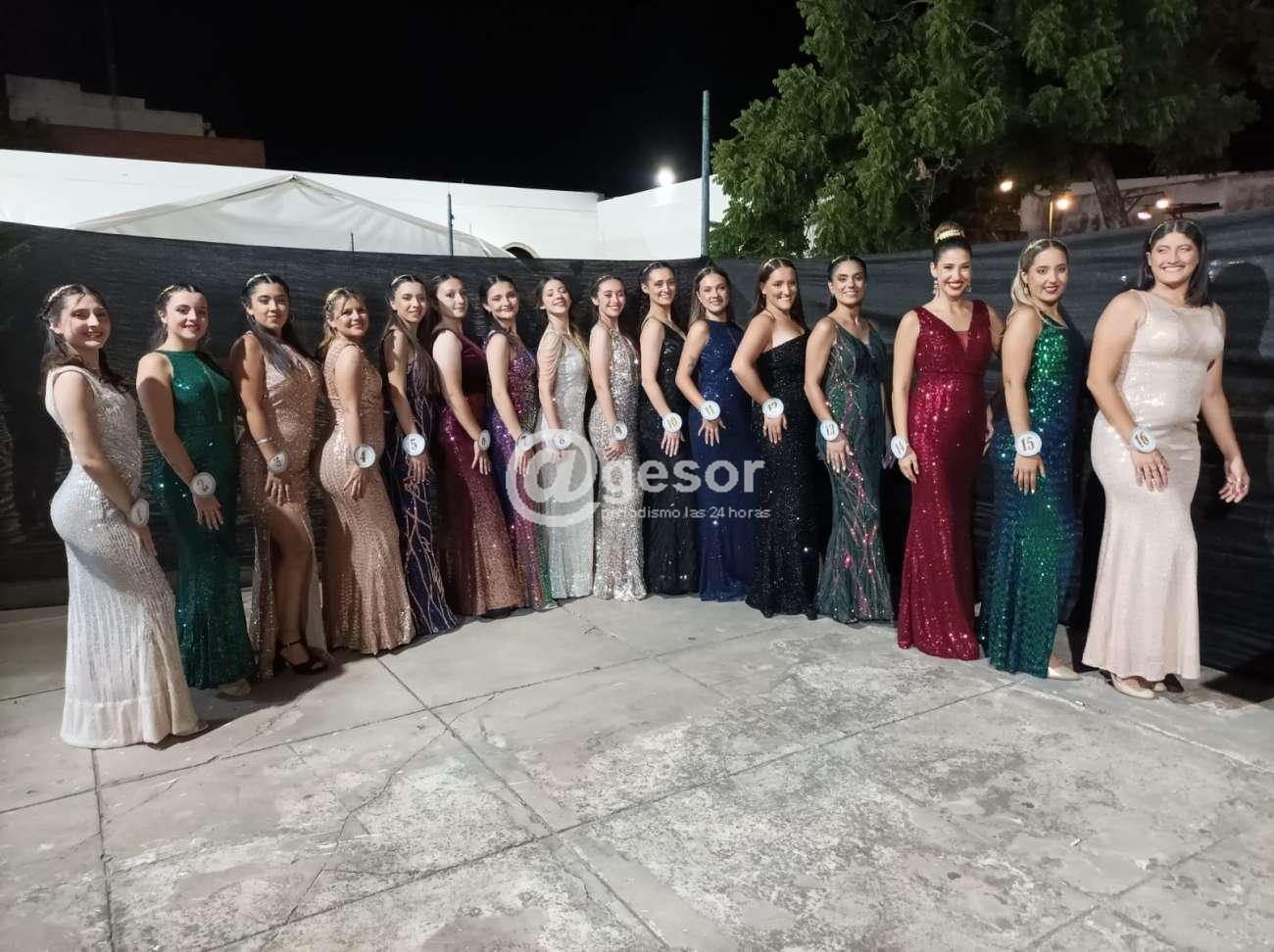 Estas son las 16 postulantes que en las fotografías se las ofrecemos con el vestido de fiesta, prontas para la última pasada, que no es válida para el Jurado, que ya a esa altura tiene tomada la decisión y no se encuentra en el lugar por haberse retirado a deliberar.