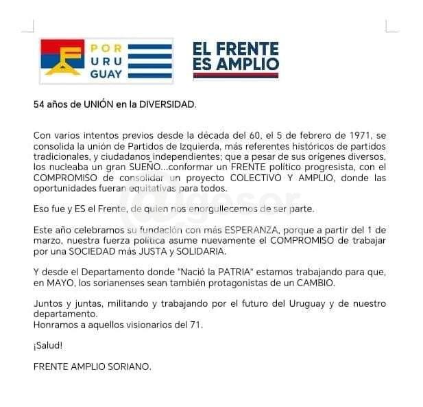 Con varios intentos previos desde la década del 60, el 5 de febrero de 1971, se consolida la unión de Partidos de Izquierda, más referentes históricos de partidos tradicionales, y ciudadanos independientes; que a pesar de sus orígenes diversos, los nucleaba un gran SUEÑO...conformar un FRENTE político progresista, con el COMPROMISO de consolidar un proyecto COLECTIVO Y AMPLIO, donde las oportunidades fueran equitativas para todos.
