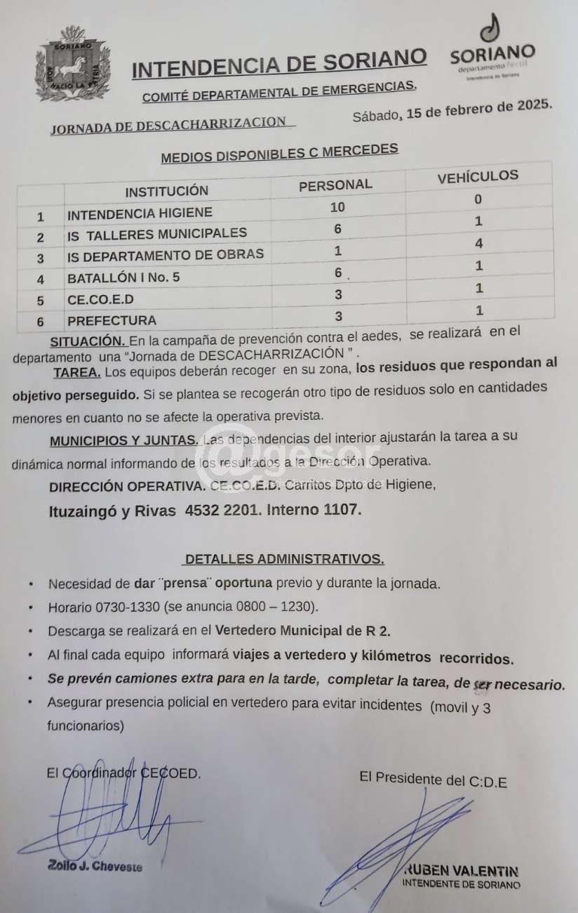 Días atrás informábamos que en las larvitrampras distribuidas en diferentes puntos de Mercedes se ha notado la presencia del Aedes aegypti, mosquito trasmisor del dengue, por lo que se decidió encarar esta nueva jornada de descacharrización. El Comité Departamental de Emergencias difundió este martes los medios que se desplegarán en el departamento para cumplir con esta tarea.