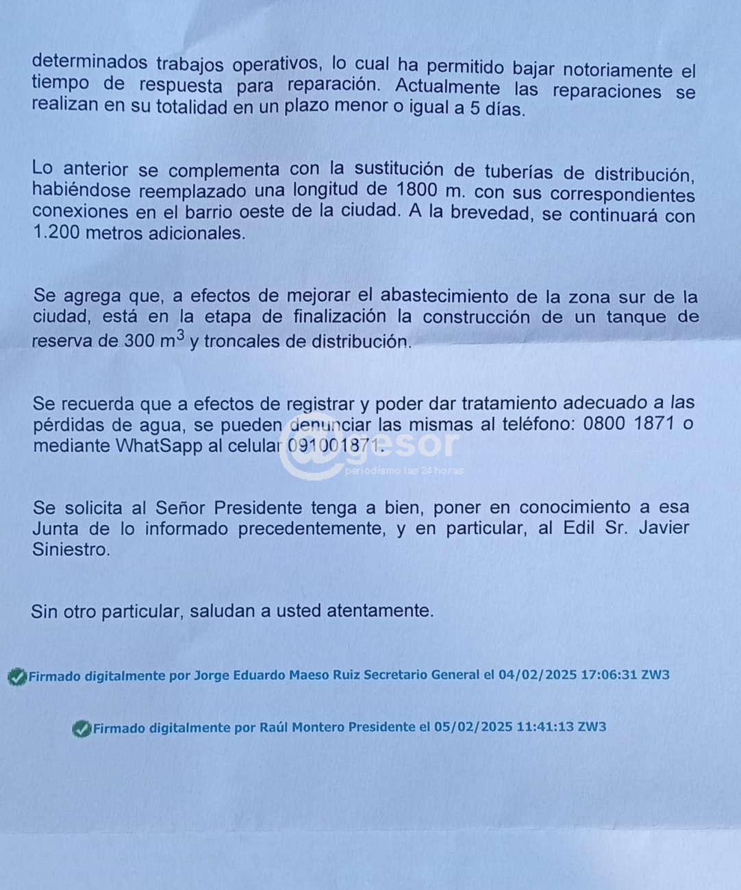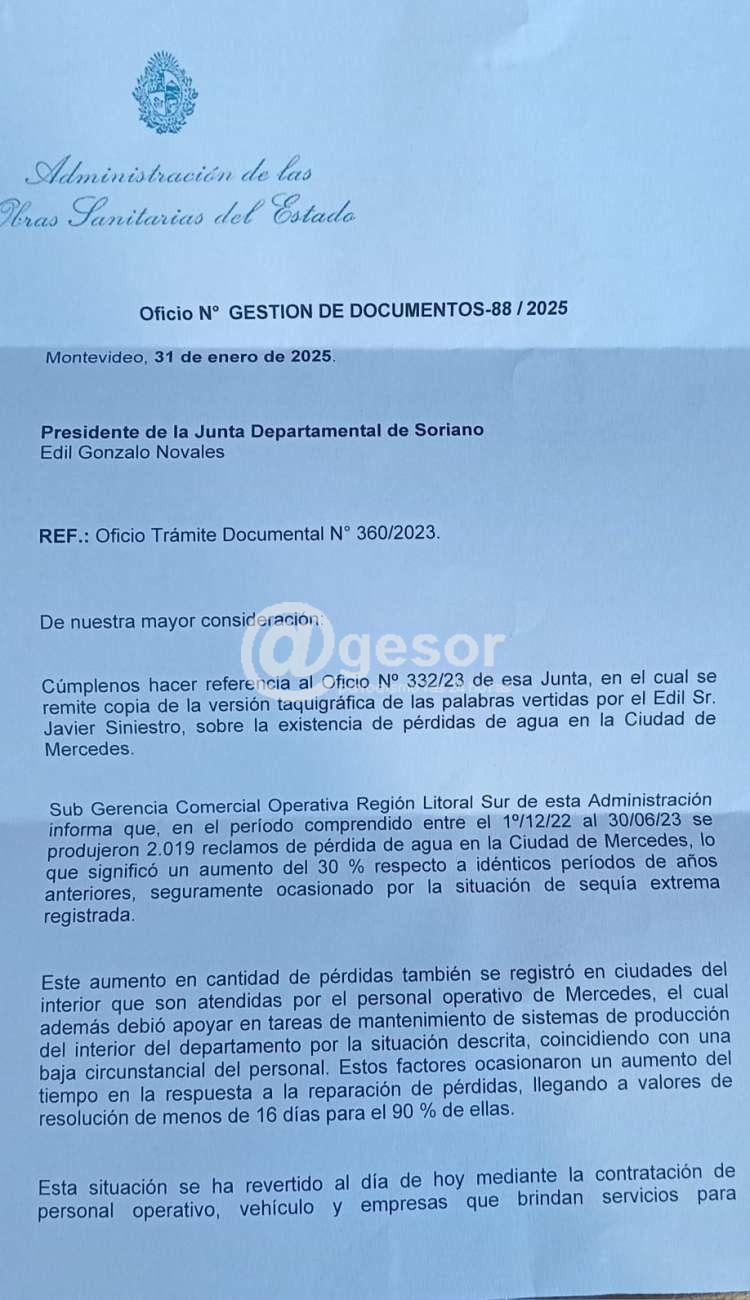 La Gerencia Comercial Operativa Regional Litoral Sur de OSE recientemente contestó al edil que "se produjeron 2.019 reclamos de pérdidas de agua en la ciudad de Mercedes, durante el periodo 2022-2023, lo que significó un aumento de un 30% respecto a idénticos periodos de años anteriores". Además que "este aumento en cantidad de pérdidas también se registró en ciudades del interior, que son atendidas por el personal operativo de Mercedes, el cual además debió apoyarse en tareas de mantenimiento del sistema de producción del interior del departamento por la situación descripta. Coincidiendo con una baja circunstancial del personal. Estos factores ocasionaron un aumento del tiempo a la respuesta a la reparación de las pérdidas, llegando a valores de resolución de menos de 16 días un 90% de ellas".
