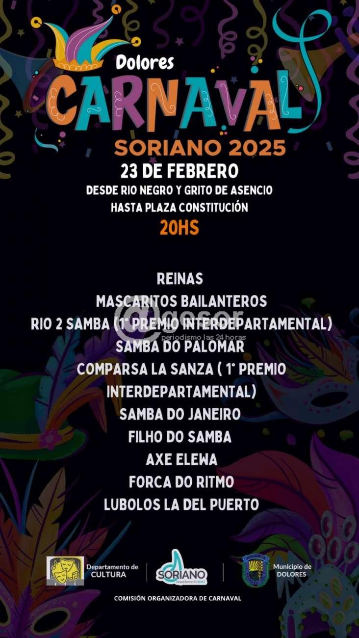Este domingo 23 de febrero será el desfile de Carnaval en Dolores, a partir de las 20.00 horas recorrerá desde Río Negro y Grito de Asencio hasta plaza Constitución.