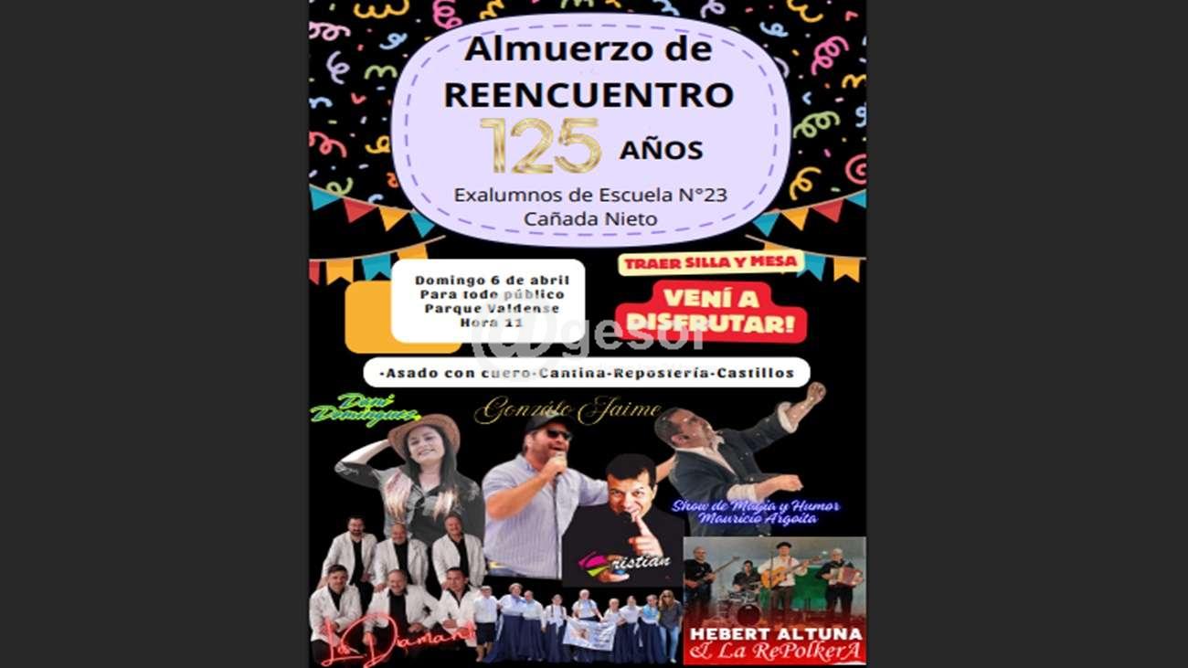 La Escuela Nº 23 de Cañada Nieto celebra sus 125 años con un almuerzo de reencuentro de sus ex alumnos. Será el domingo 6 de abril, en una actividad abierta a todo público, comenzando a las 11 horas en el Parque Valdense.