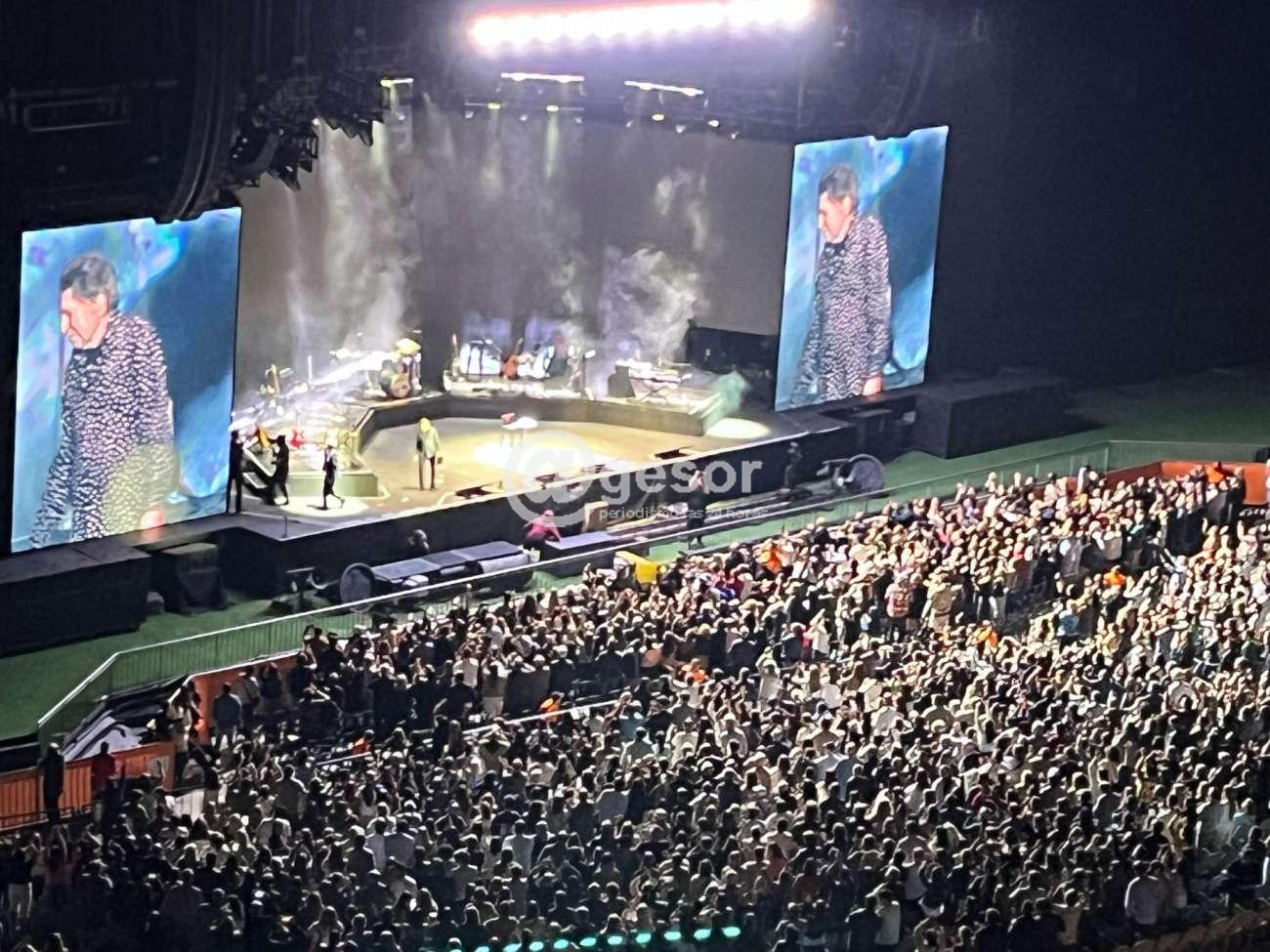 El espíritu de despedida se mantuvo durante las dos horas de espectáculo. En un principio, y pasadas las 21 horas, cuando abrió con el videoclip de “Un último vals”, en el que las apariciones de Joan Manuel Serrat y Ricardo Darín fueron ovacionadas por el público. A continuación, con “Lágrimas de mármol” y “Lo niego todo”, que ambientaron un confesionario a cielo abierto.