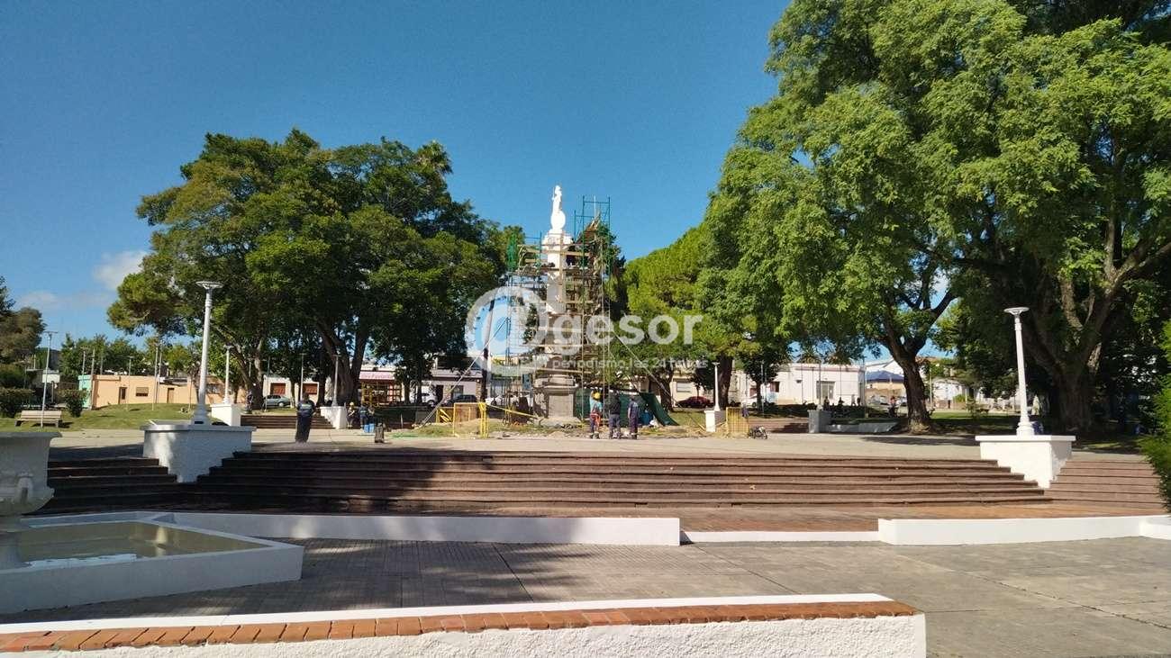 Personal de la comuna trabaja en los detalles finales de la columna y la estatua, al tiempo que se realizan reparaciones en diversas áreas de la plaza para dejar todo en condiciones para el acto programado.