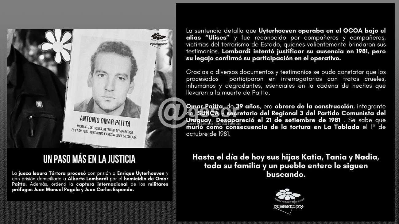 La sentencia señala que Uyterhoeven, identificado por víctimas del terrorismo de Estado, operaba en el OCOA bajo el alias “Ulises”, mientras que Lombardi, pese a intentar negar su participación, fue vinculado al operativo mediante su legajo. Testimonios y documentos confirman que ambos participaron en interrogatorios violentos que culminaron con la muerte de Paitta.
