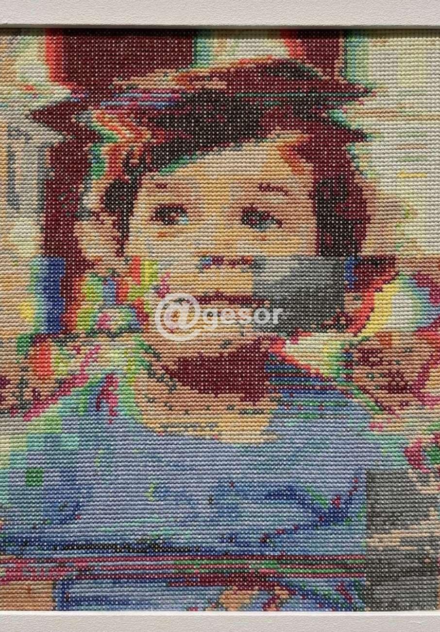 Se trata de 18 obras bordadas a mano que nos permiten apreciar el antiguo arte de bordar llevada a pixeles, para crear obras que recrean símbolos de la cultura popular y moderna, como son los gif, dibujos animados de su niñez, así como el homenaje a artículos cotidianos, como las cajas de galletitas devenidas en costureros, los frascos de polvo de hornear y hasta fotos de niño del artista pixeladas.