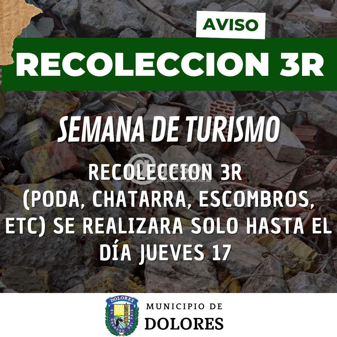 El Municipio de Dolores informa sobre el servicio de "Recolección 3R" que incluye poda, chatarra, escombros, etc. que druante la semana de Turismo, se realizará sólo hasta el jueves 17 de abril.