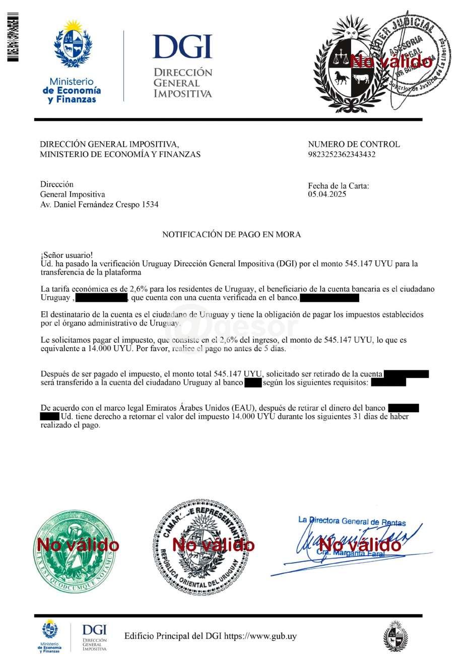 Solicitamos a todos los destinatarios que no respondan ni realicen ningún tipo de pago y que, en caso de que consideren necesario, lo informen a Reporte de incidentes técnicos de DGI.
