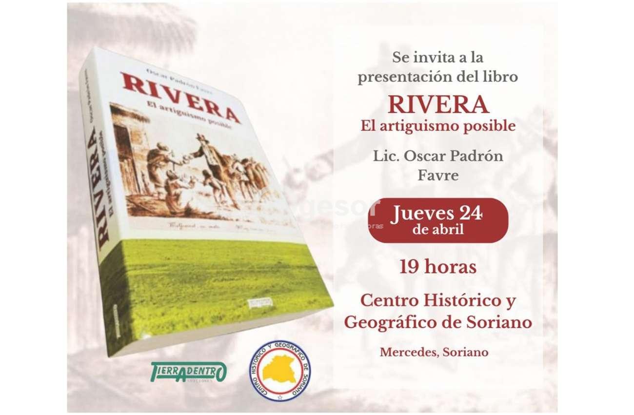 ´Rivera el artiguismo posible´ un libro del Lic. Oscar Padrón Favre será presentado ese jueves en el Centro Histórico y Geográfico de Soriano. Calificada en su prólogo como “ Una biografía casi inabarcable” esta investigación del Lic. Padrón Favre emprende la tarea de acercarse a la figura de Rivera con el riesgo que “supone enfrentar de forma constante la sensación de estar frente a algo inabarcable e inaprensible. En especial si se hace con ánimo de profundizar en ella, de acercarse a toda su complejidad y múltiples facetas, saliendo de los estereotipos fáciles que todo lo resuelven con unos pocos adjetivos. La sensación de inabarcable nace tanto de lo extensa que fue su actuación como por lo intensa en acontecimientos. En ambos aspectos sin parangón en el plano nacional y con pocos émulos en el continental”.
