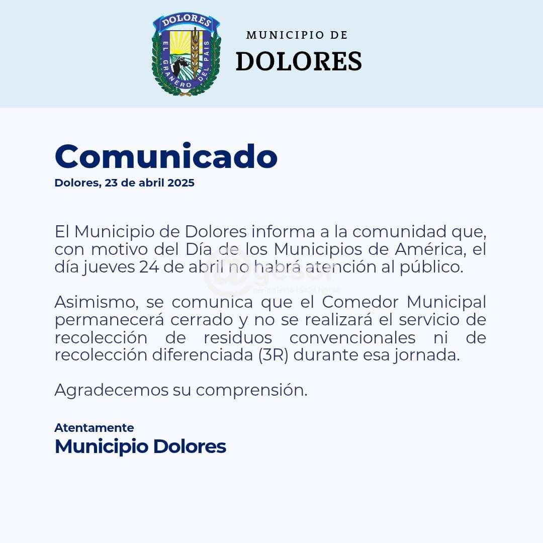 El Municipio de Dolores informa a la comunidad que, con motivo del Día de los Municipios de América, el día jueves 24 de abril no habrá atención al público, tampoco funcionará el comedor municipal.