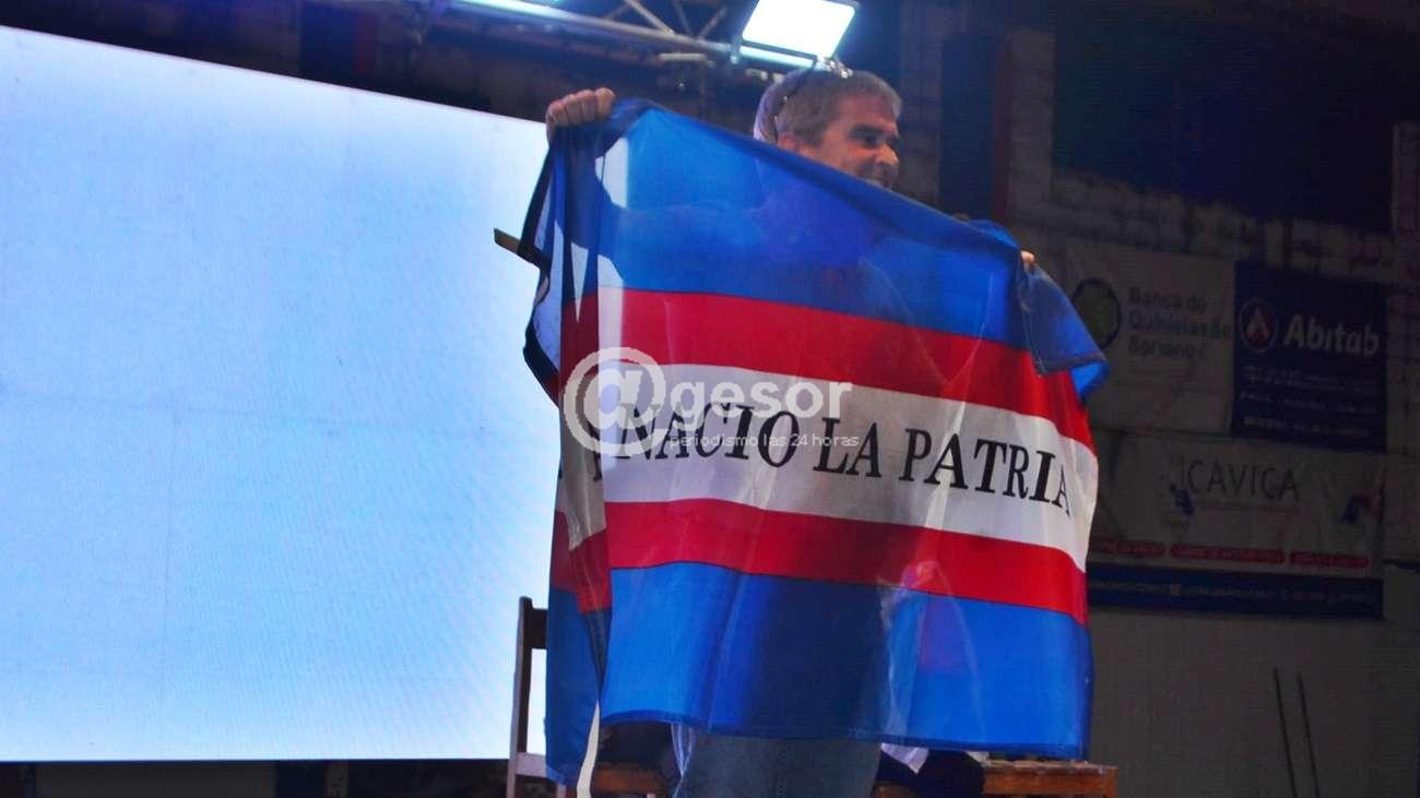 Sobre el final de su discurso Ponce extendió una bandera de Soriano, que llevaba colgada a modo de poncho. “La bandera de los colores de Artigas. Que dice ni más ni menos. Que aquí nació la patria”. Pidiendo “volvamos a hacer nacer la patria. Con los colores de Artigas.
