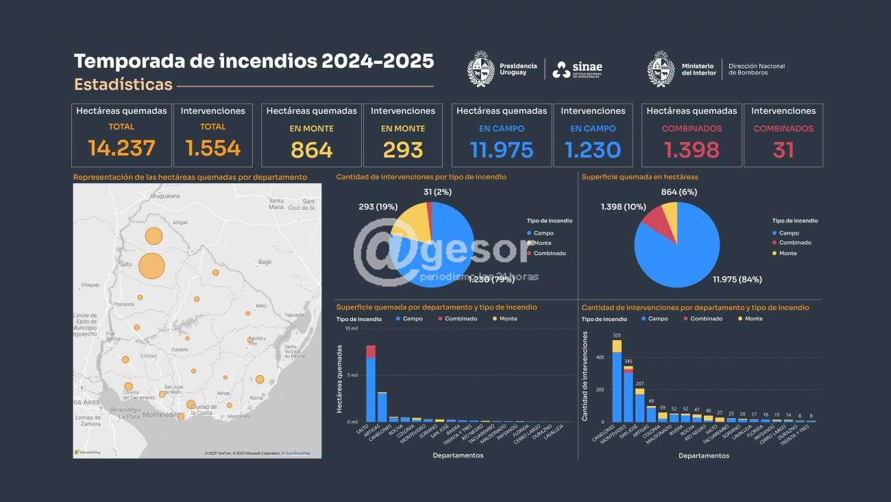 En la pasada temporada durante la vigencia del mencionado Decreto, es decir entre el 1° de noviembre de 2024 y el 30 de abril de 2025, hubo un total 1.554 intervenciones por parte de Bomberos. 293 de ellas se debieron a incendios en monte, 1.230 a incendios de campo y 31 por incendios combinados.