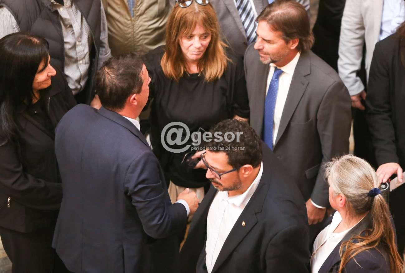 El presidente Orsi, junto a la vicepresidenta de la República Carolina Cosse; al secretario y prosecretario de la Presidencia, Alejandro Sánchez y Jorge Díaz, respectivamente, así como el gabinete ministerial en pleno, están presentes en el Salón de los Pasos Perdidos.