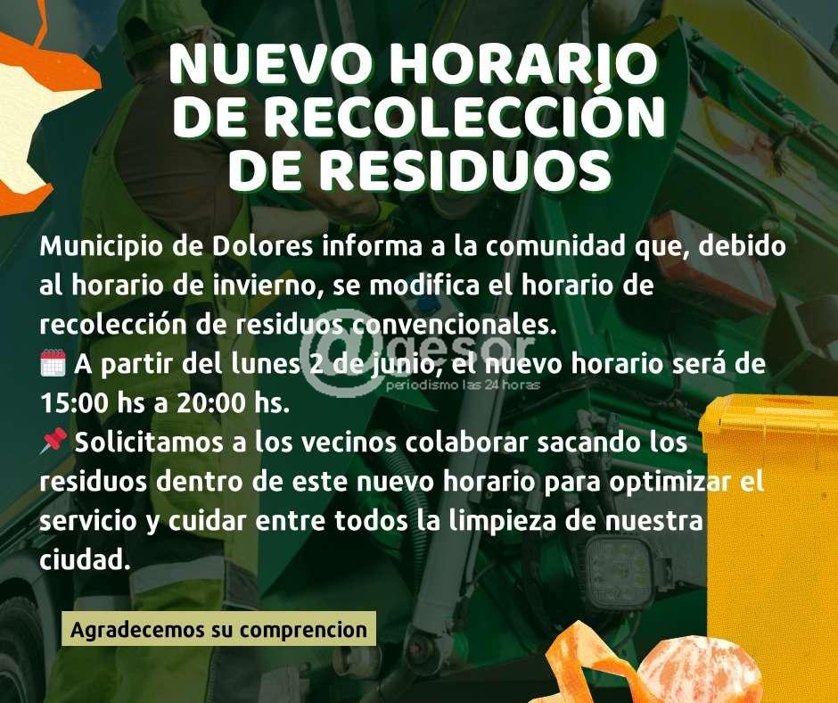 Municipio de Dolores informa a la comunidad que, debido al advenimiento del invierno, se modifica el horario de recolección de residuos convencionales.