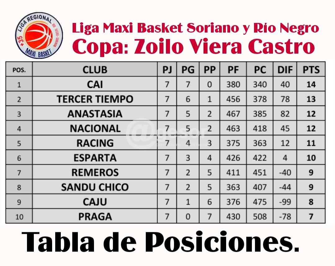 Independiente 14 pts, Tercer Tiempo 13 pts, Anastasia y nacional 12 pts, Racing 11 pts, Esparta 10 pts, Remeros y Sandú Chico 9 pts, Juventud Uruguay 8 pts y Praga 7 pts.