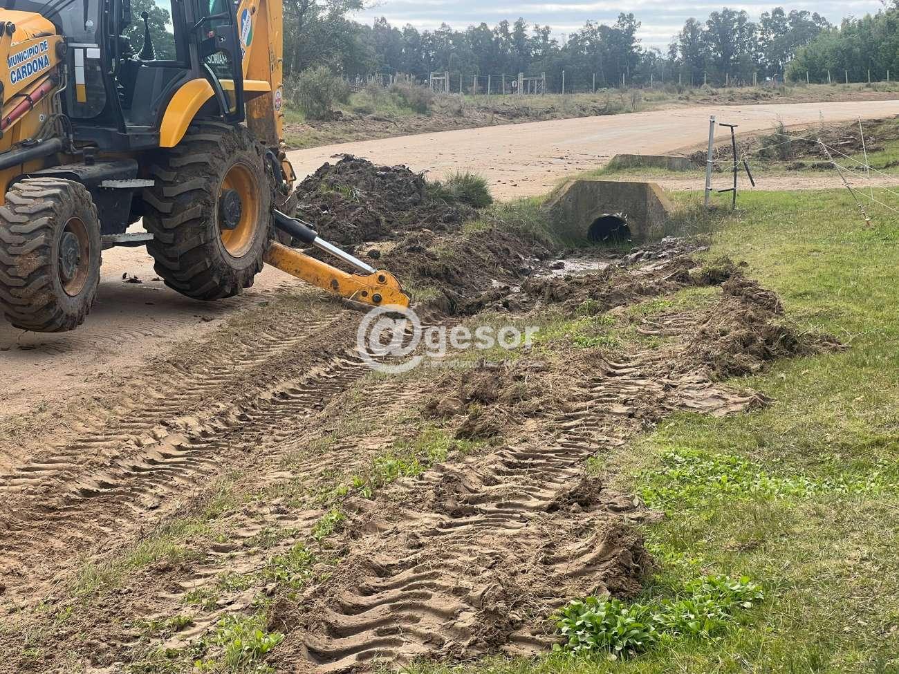 En el lugar se despliega maquinaria vial compuesta por motoniveladora, camión regador, cilindro compactador y retroexcavadora. Las tareas incluyen perfilado de la calzada, limpieza de cunetas, así como desobstrucción de caños y alcantarillas.