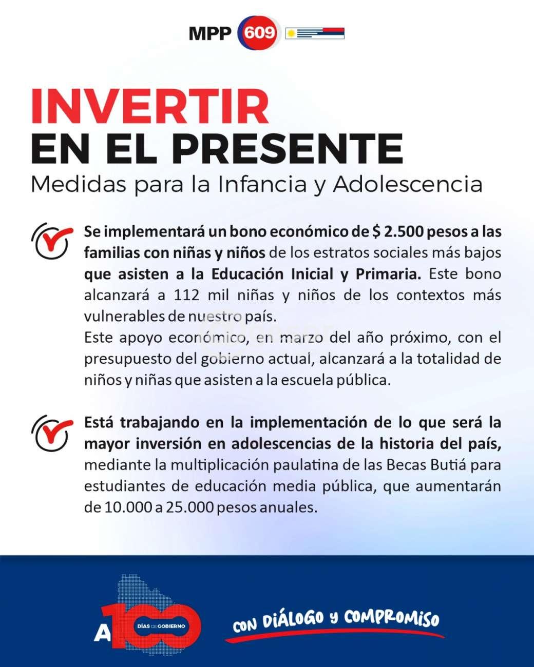 - Se implementará un bono económico de $ 2.500 a las familias con niñas y niños de los estratos sociales más bajos que asisten a la Educación Inicial y Primaria. Este bono alcanzará a 112 mil niñas y niños de los contextos más vulnerables de nuestro país.