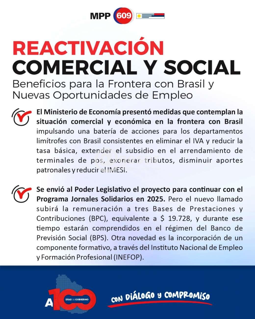 - El Ministerio de Economía presentó medidas que contemplan la situación comercial y económica en la frontera con Brasil impulsando una batería de acciones para los departamentos limítrofes con Brasil consistentes en eliminar el IVA y reducir la tasa básica, extender el subsidio en el arrendamiento de terminales de pos, exonerar tributos, disminuir aportes patronales y reducir el IMESI.