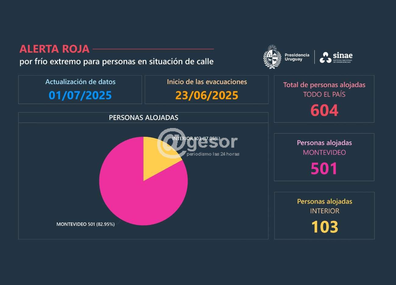 En su resumen diario, el Sistema Nacional de Emergencias (Sinae) informó que, desde el inicio de la alerta nacional de nivel rojo, el número de personas que se alojó en los refugios del Ministerio de Desarrollo Social fue el siguiente: