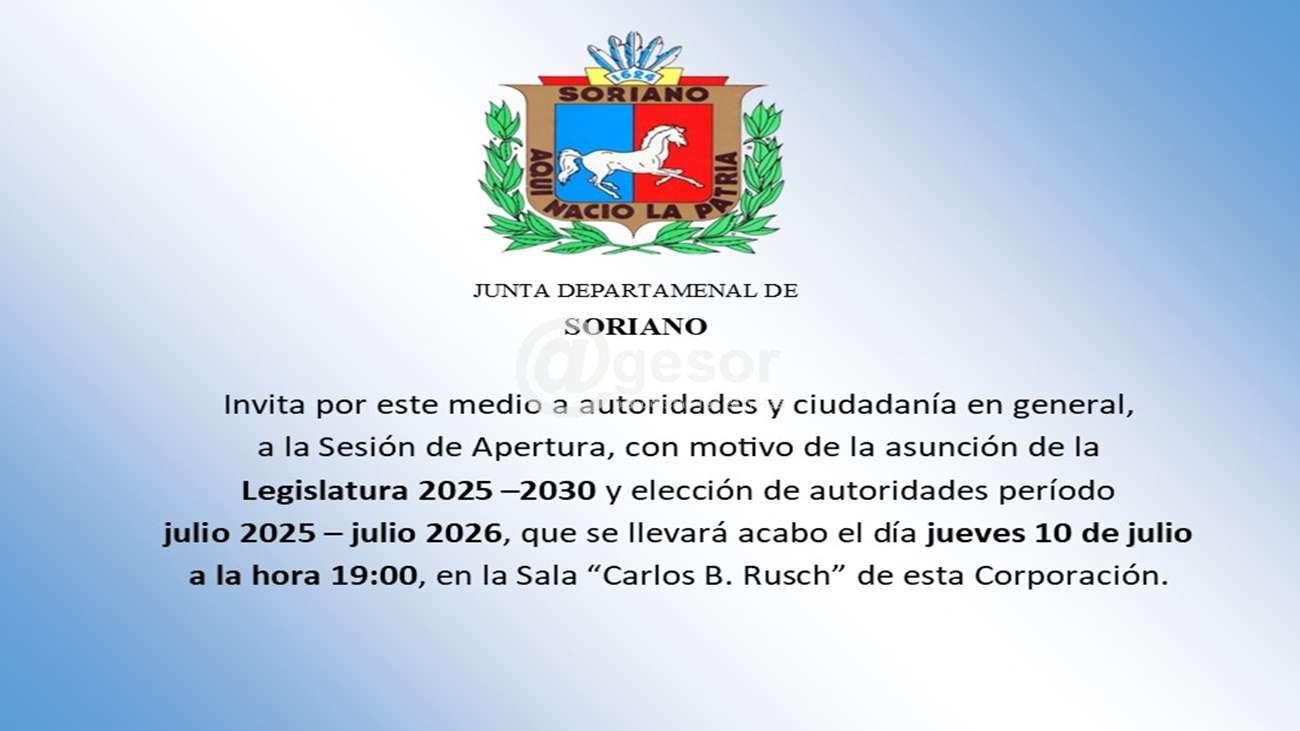 La Junta Departamental de Soriano invita por este medio a autoridades y ciudadanía en general, a la sesión de apertura, con motivo de la asunción de la Legislatura 2025-2030 y la elección de autoridades período julio 2025- julio 2026, que se llevará a cabo el día jueves 10 de julio a la hora 19, en Sala Carlos B. Rusch de esta corporación.