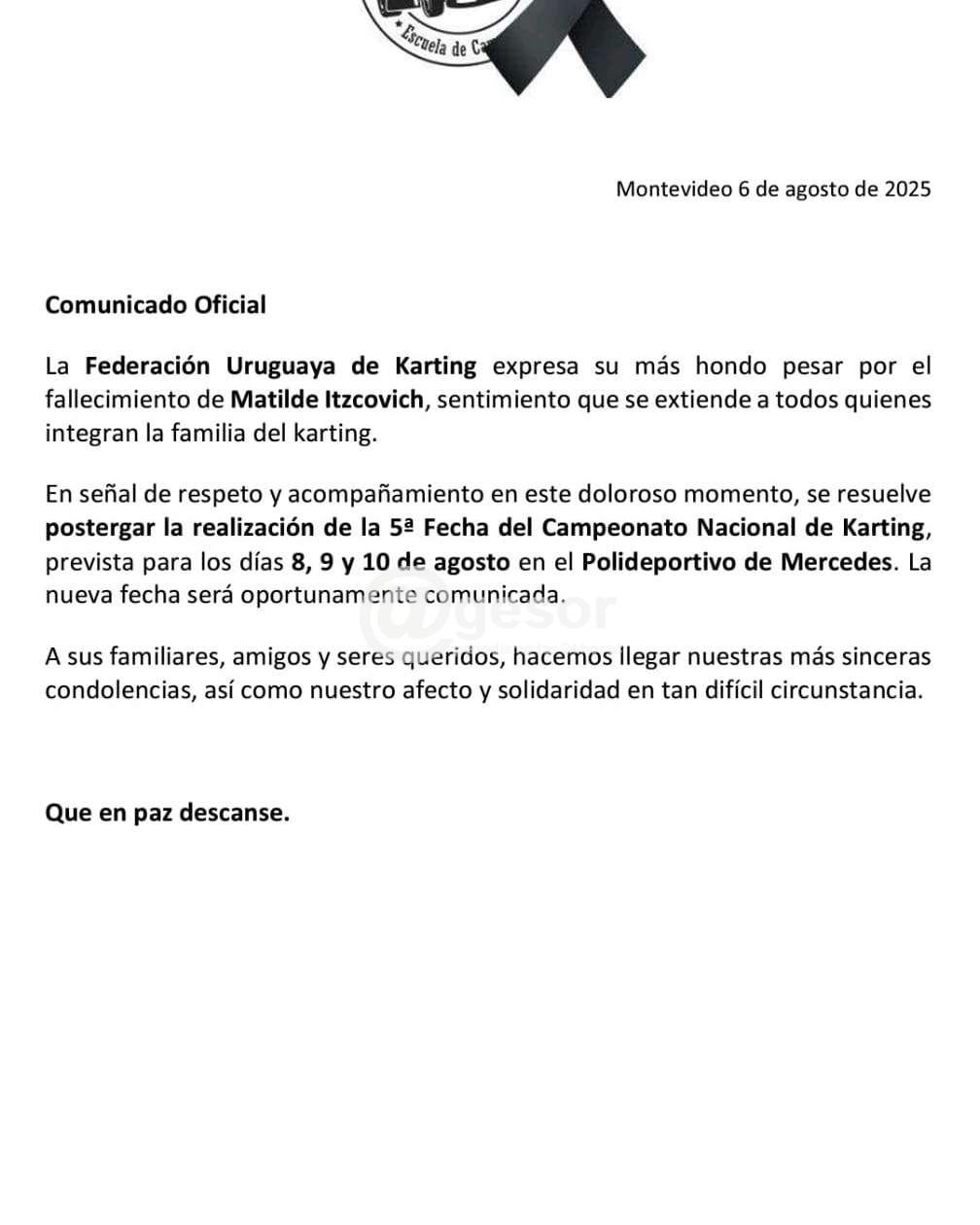 Al respecto la Intendencia de Soriano emitió un comunicado: “La  Intendencia de Soriano informa que en virtud del luctuoso hecho sucedido este miércoles, el  Polideportivo de Mercedes permanecerá cerrado el día jueves 7 de agosto en señal de respeto ante tan doloroso momento que vive toda la familia del karting y en particular, los familiares de Matilde Itzcovich, competidora de esta especialidad fallecida en la jornada.
