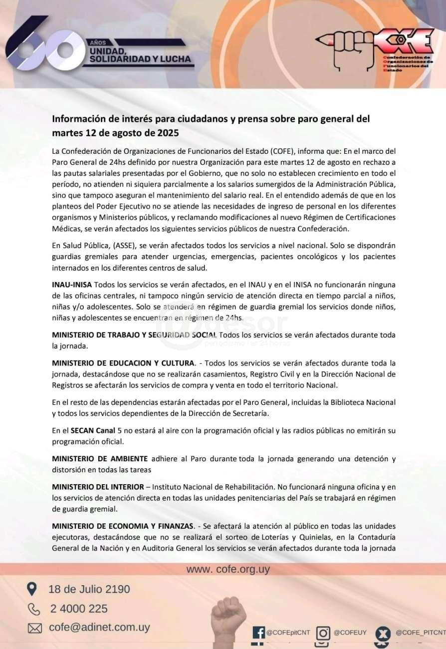 En el marco del Paro General de 24 horas definido por nuestra organización para este martes 12 de agosto, en rechazo a las pautas salariales presentadas por el Gobierno —que no solo no establecen crecimiento en todo el período, no atienden ni siquiera parcialmente a los salarios sumergidos de la Administración Pública, sino que tampoco aseguran el mantenimiento del salario real—, y entendiendo además que en los planteos del Poder Ejecutivo no se atienden las necesidades de ingreso de personal en los diferentes organismos y ministerios públicos, y reclamando modificaciones al nuevo Régimen de Certificaciones Médicas, se verán afectados los siguientes servicios públicos de nuestra Confederación: