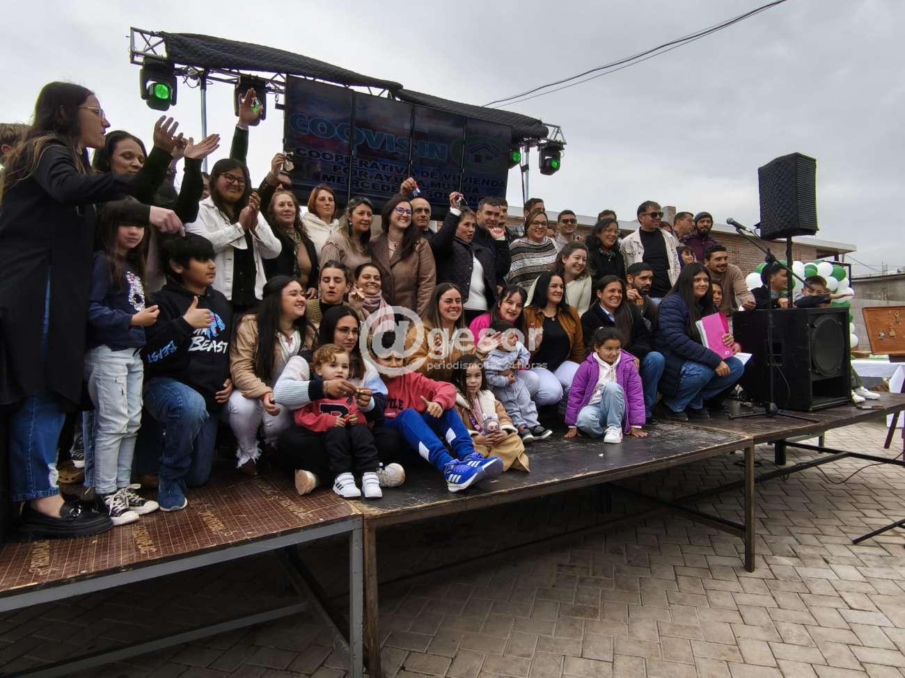 Posteriormente se convocó uno a uno a los 40 socios a recibir la llave de su vivienda y a la foto de todo el grupo sobre el escenario, respecto de lo cual informamos por separado.