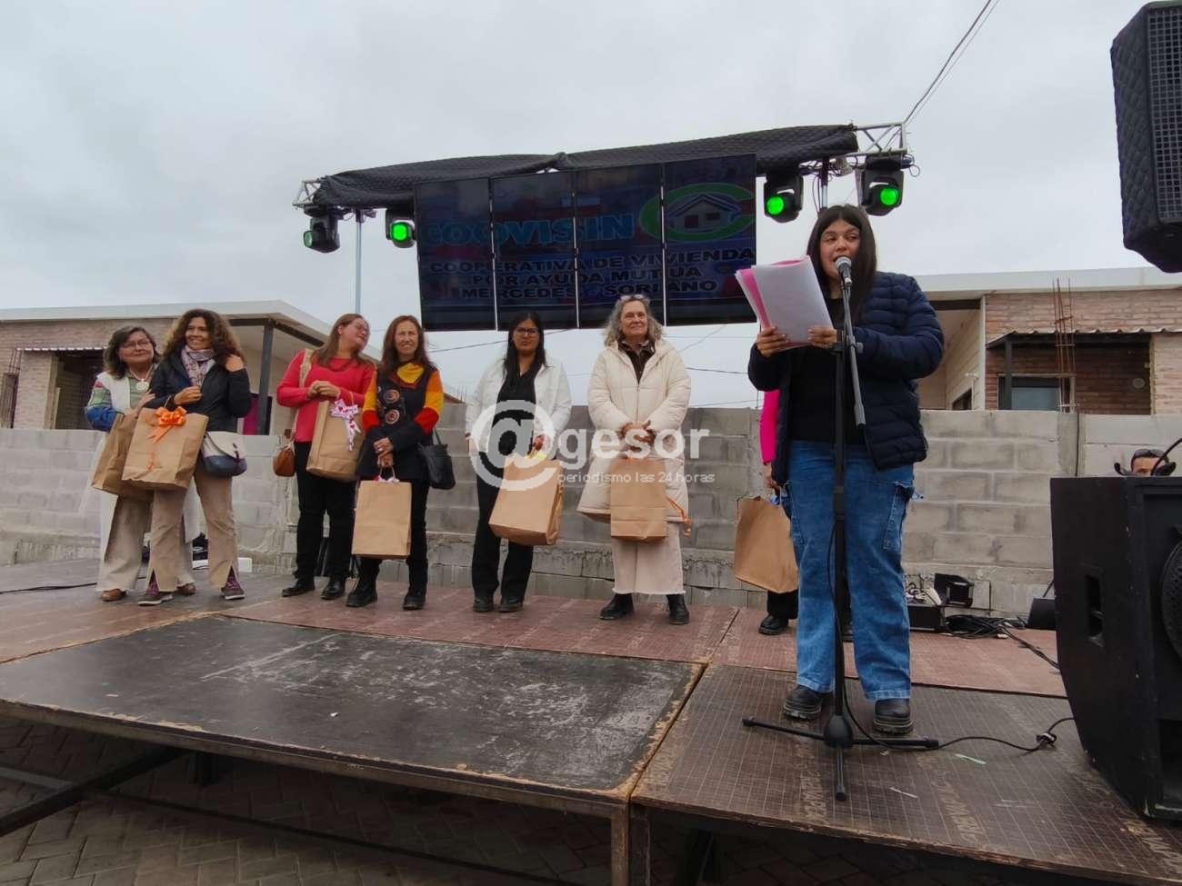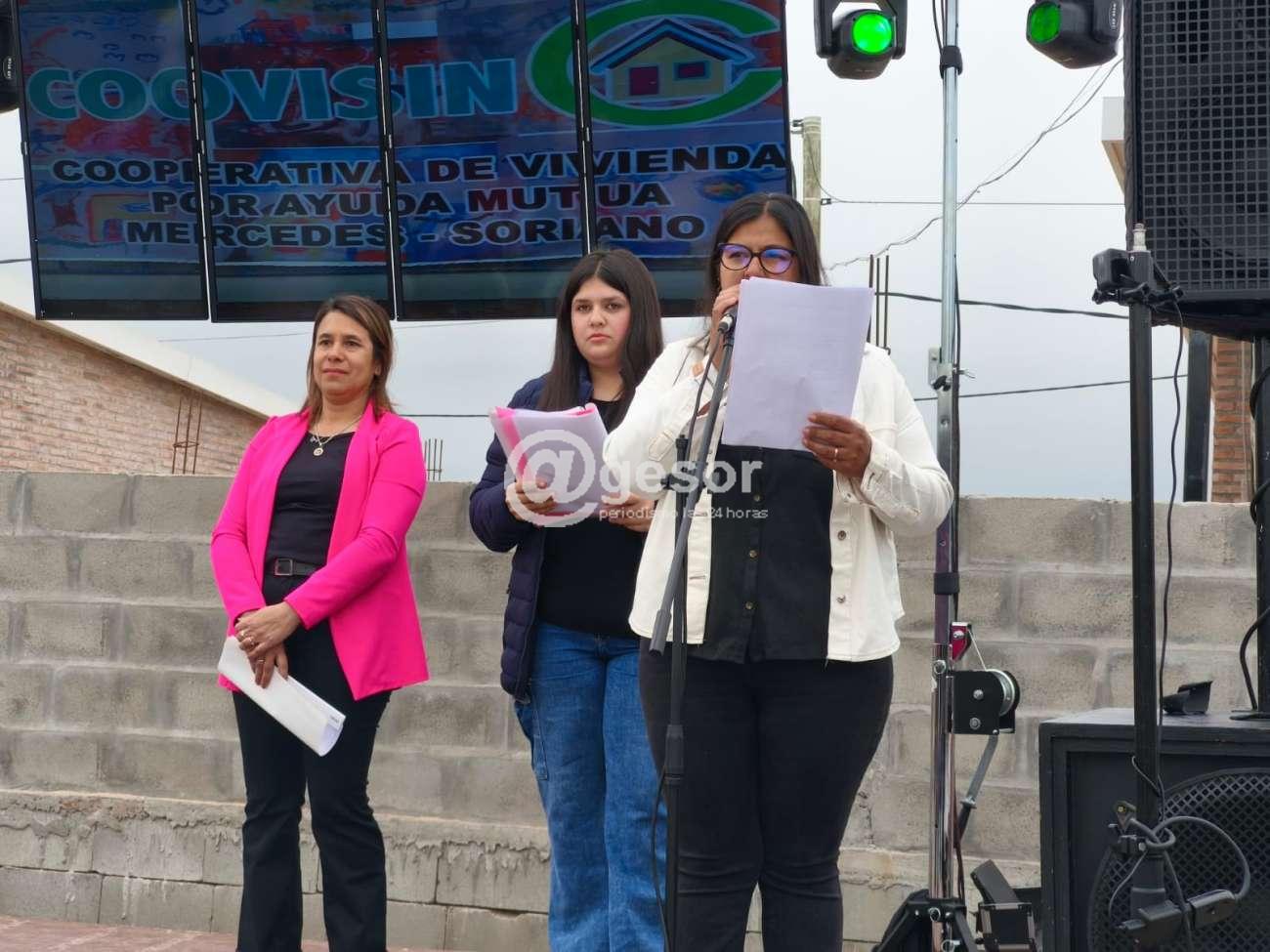 A continuación, Ashelen Cáceres integrante de la cooperativa señaló, "estamos aquí hoy sábado 16 de agosto de 2025 en el padrón catastral 11107 de la ciudad de Mercedes, del departamento de Soriano, situado en Diego Lamas y Artigas, para la inauguración de la cooperativa que aquí se construyó, la Cooperativa de Vivienda Sindical C.