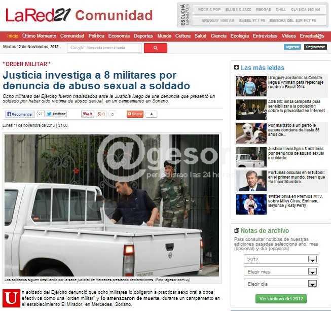 Amplia repercusión ha tenido la noticia sobre el abuso sufrido por un militar en el campamento montado cerca de Palmar. Desde que ayer a la tarde @gesor difundió este caso al publicar la denuncia del militar víctima de este abuso, el tema comenzó a repercutir en los principales medios de comunicación de la región y de la capital del país. Al punto que a las pocas horas eran escasos los medios de comunicación que no habían reproducido parcial o totalmente lo informado por nuestra agencia de noticias, comenzando a delegar periodistas para cubrir las novedades que pudieran surgir.