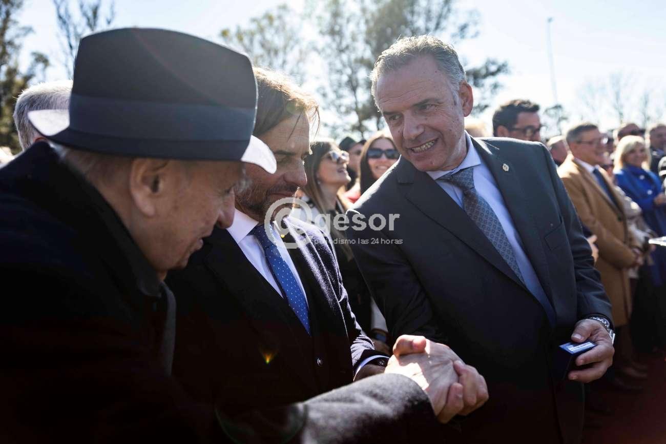 A continuación, Enciso hizo entrega de medallas conmemorativas al presidente de la República, Yamandú Orsi, y a los expresidentes, Luis Lacalle Pou y Julio María Sanguinetti.