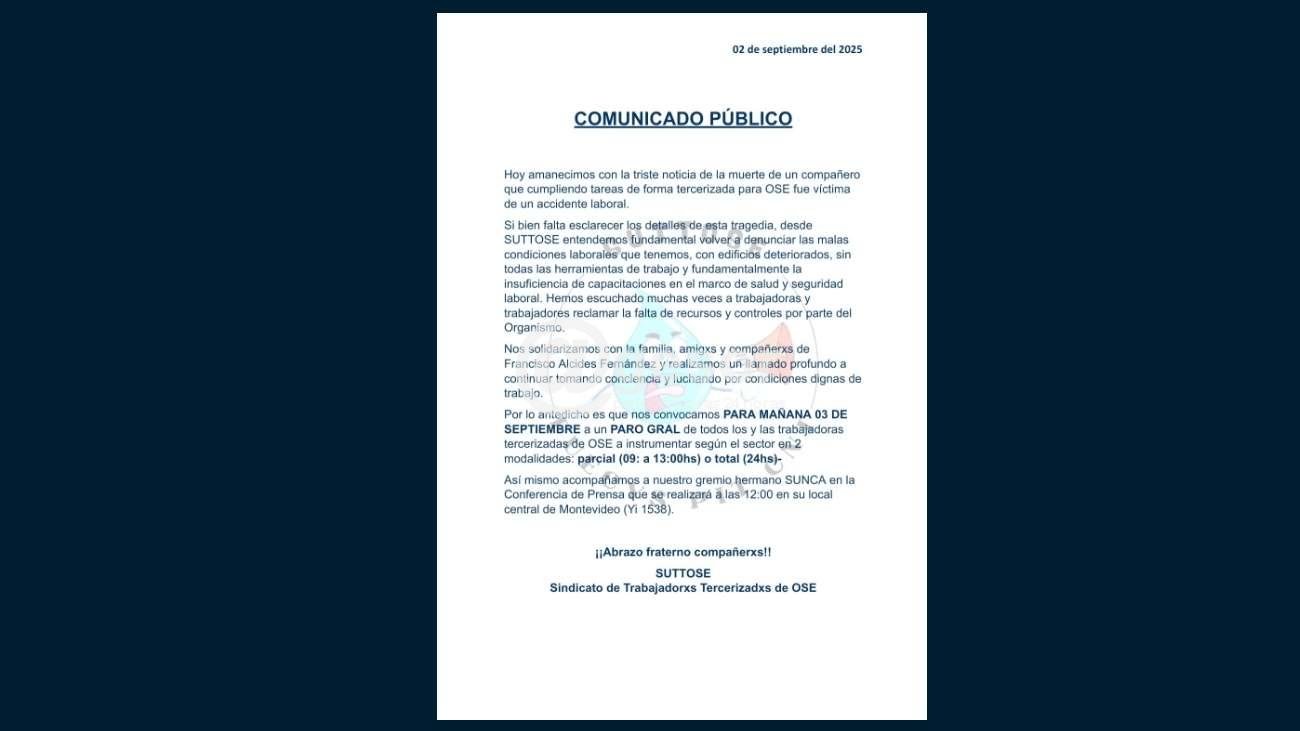 Por lo antedicho es que nos convocamos PARA MAÑANA 03 DE SEPTIEMBRE a un PARO GRAL de todos los y las trabajadoras tercerizadas de OSE a instrumentar según el sector en 2 modalidades: parcial (09: a 13:00hs) o total (24hs).