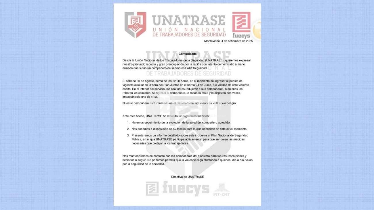 Presentaremos un informe detallado sobre este incidente al Plan Nacional de Seguridad Pública, en el que UNATRASE participa activamente, para que se tomen las medidas necesarias que protejan a los trabajadores.