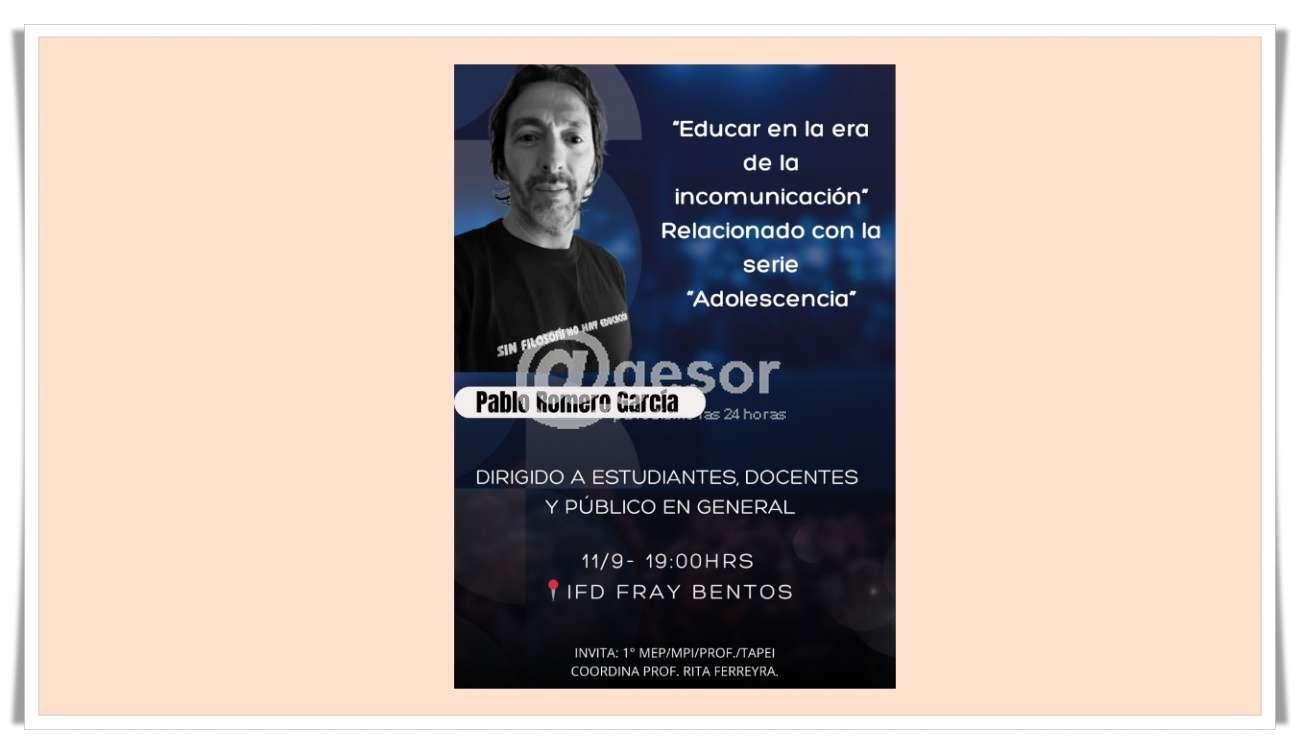 El prof. Pablo Romero estará dictando charlas en distintos puntos del país sobre “Educar en la era de la incomunicación” relacionando este tema con la serie “Adolescencia”. Esta charlas están dirigida a estudiantes, docentes y público en general. En Fray Bentos estará el 11 de setiembre próximo a las 19 horas, en el Instituto de Formación Docente.