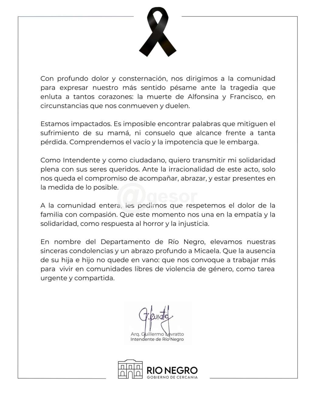 En nombre del Departamento de Rio Negro, elevamos nuestras sinceras condolencias y un abrazo profundo a Micaela. Que la ausencia de su hija e hijo no quede en vano: que nos convoque a trabajar más para vivir en comunidades libres de violencia de género, como tarea urgente y compartida.