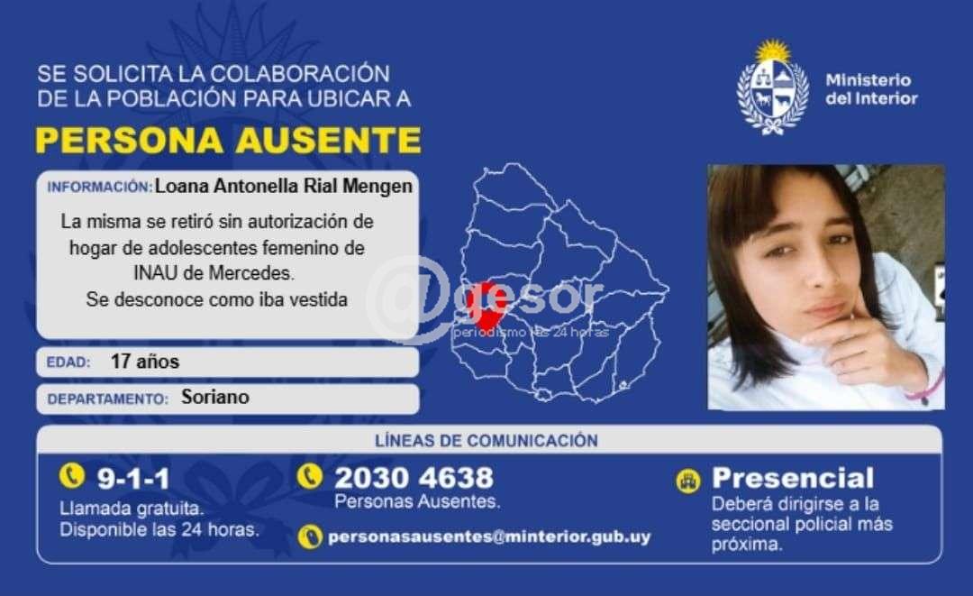 Se trata de joven de 17 años que se retiró sin autorización del Hogar de Adolescentes femenino de INAU de Mercedes.