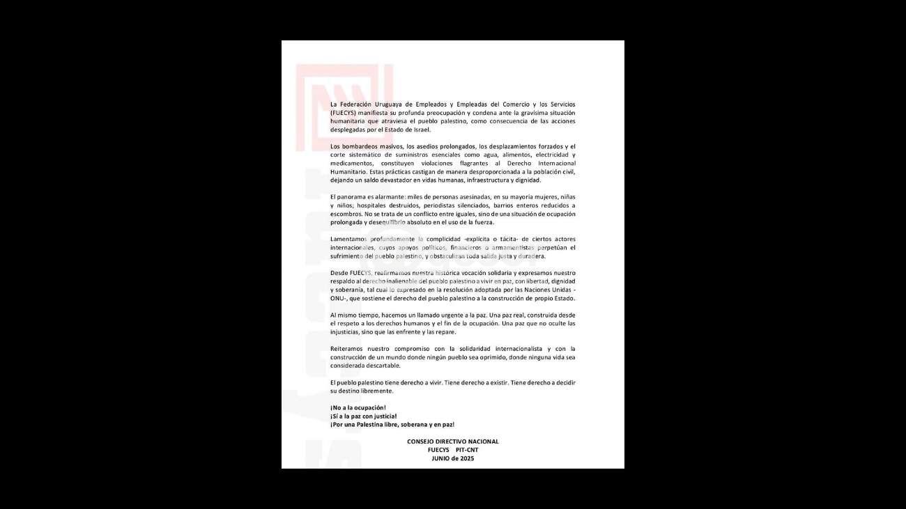La Federación Uruguaya de Empleados y Empleadas del Comercio y los Servicios (FUECYS) manifiesta su profunda preocupación y condena ante la gravísima situación humanitaria que atraviesa el pueblo palestino, como consecuencia de las acciones desplegadas por el Estado de Israel.