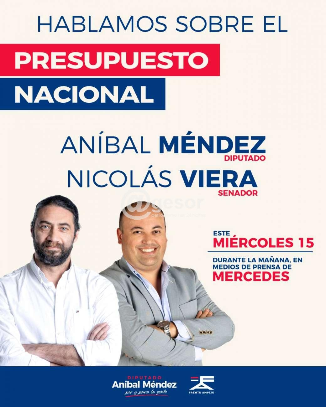 Este miércoles 15, durante la mañana, el Diputado Aníbal Méndez y el Senador Nicolás Viera estarán en los medios de prensa de Mercedes, compartiendo la mirada del gobierno sobre el próximo Presupuesto Nacional.