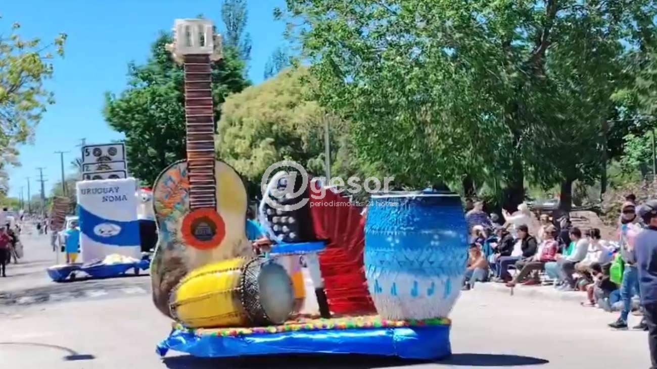 Primer Puesto (1266 puntos): N° 5, Bachilleratos Unidos de la Escuela Técnica de Cardona, con la carroza “Uruguay nomá”.