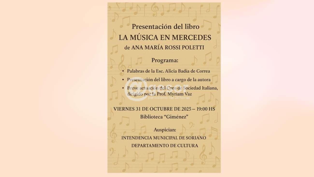 Ana María Rossi, docente y pianista de reconocida trayectoria en en medio presentará su libro "La música en Mercedes". La actividad se cumplirá en la sala de conferencias de la Biblioteca Eusebio Giménez, siendo acompañada por la Esc. Alicia Badía de Correa, quien tendrá a su cargo la presentación. Además el Coro de Sociedad Italiana, dirigido por la Prof. Myriam Vaz realizará una breve presentación.