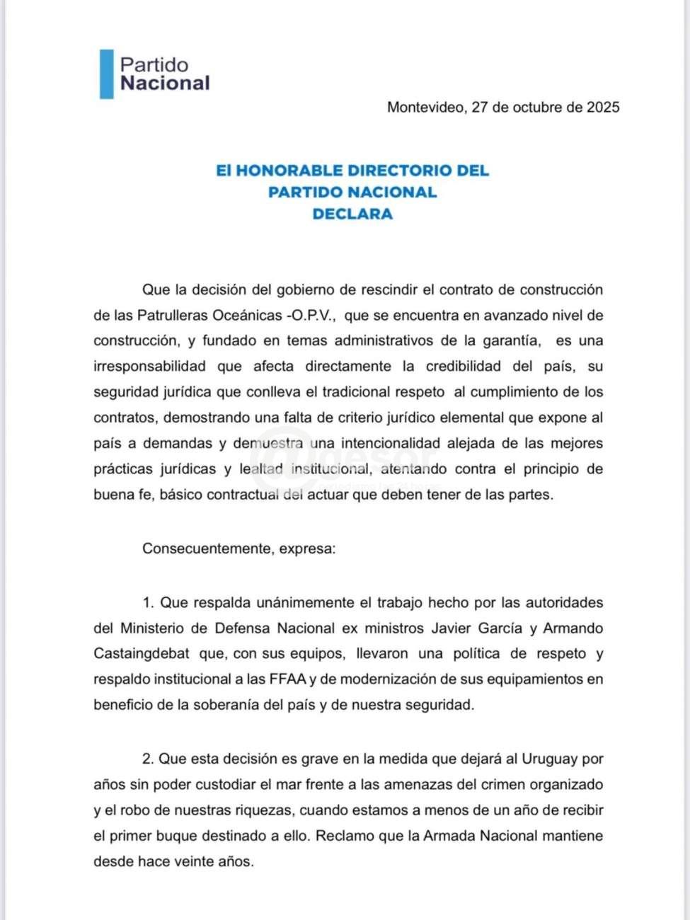 Que esta decisión es grave en la medida que dejará al Uruguay por años sin poder custodiar el mar frente a las amenazas del crimen organizado y el robo de nuestras riquezas, cuando estamos a menos de un año de recibir el primer buque destinado a ello. Reclamo que la Armada Nacional mantiene desde hace veinte años.