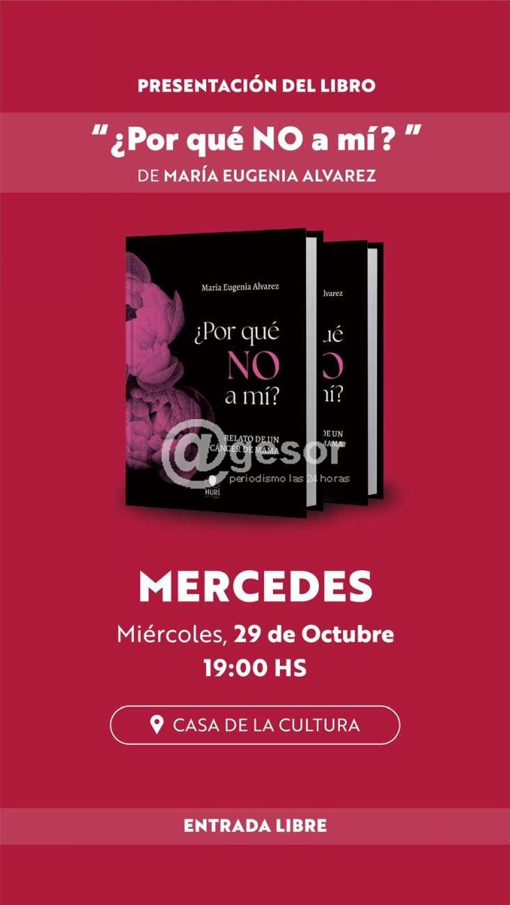 Este miércoles 29 de octubre, a las 19 hs., en la Casa de la Cultura de Mercedes, se presenta el libro "¿Por qué NO a mí?", de María Eugenia Alvarez (por Editorial Hurí).